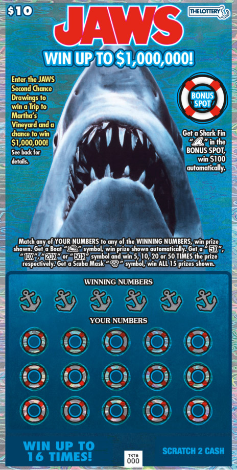 The game’s launch will be kicked off with special JAWS-themed events at the Mass Lottery’s headquarters and regional offices. Lottery players and fans of the iconic film are invited to attend to celebrate the launch, receive promotional tickets, and play games for a chance to win cash and custom, co-branded JAWS merchandise.
